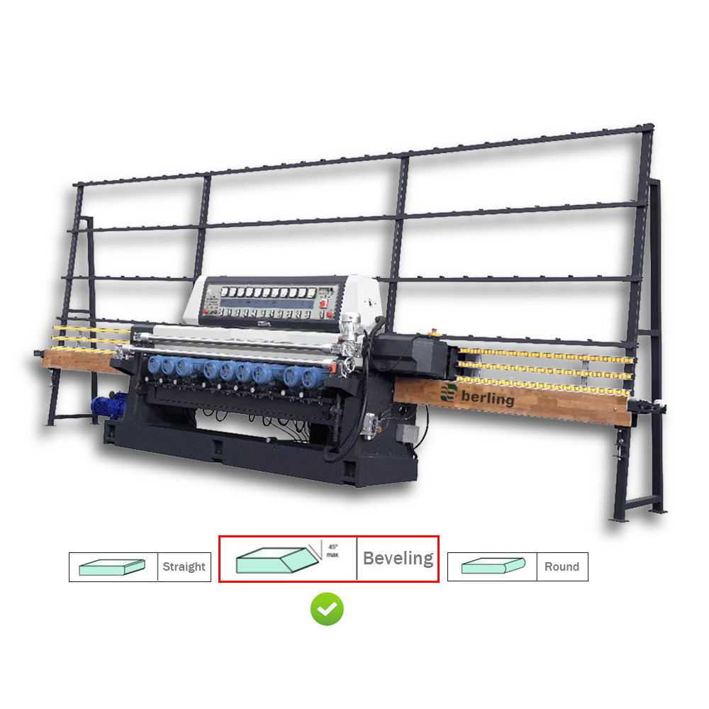 The swing drive motor allows for precise control of the swing frame angle, which can be electrically adjusted. The processing thickness is adjustable both manually and automatically, providing flexibility in operation. For ease of use, the thickness can be monitored and adjusted by referencing the thickness display.Glass edge polishing and beveling machine,2-27 Degree Beveling Machine glass processing line, the glass beveling machine is a 8/9/10/11 motors bevel and bottom grinding machine, it can complete rough grinding and fine grinding in one time, the polished effect is similar to a mirror surface, with accurate ground angles.